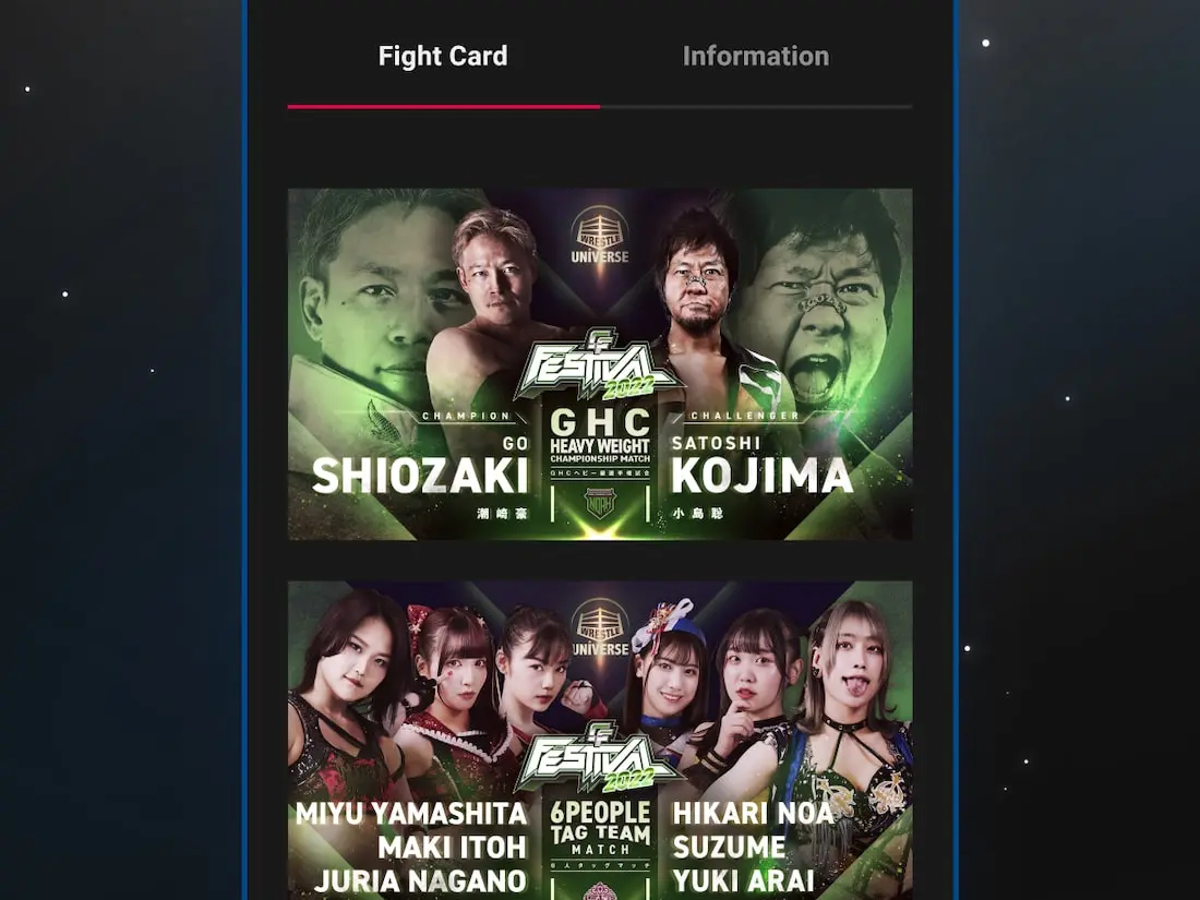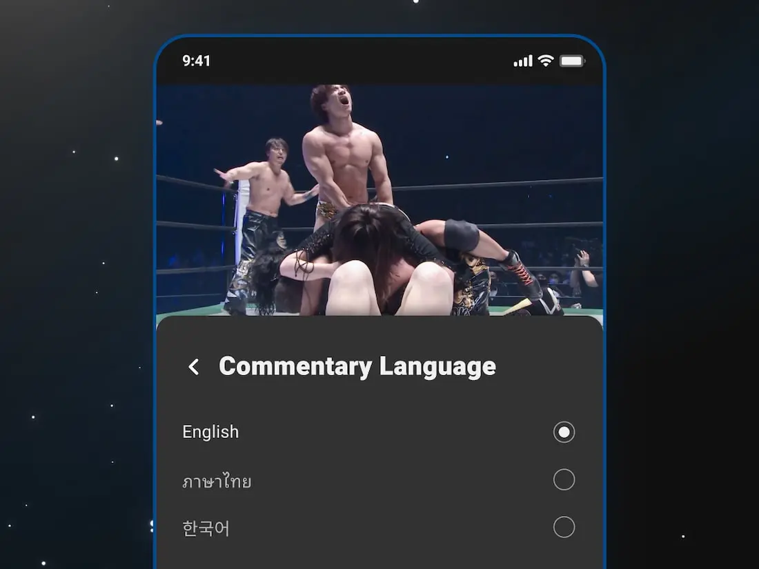 The experience enhancing commentary audio can be switched via alternative audio channels during streams. This multilingual support allows us to bring the excitement of the event to as many fight fans as possible. *Language support available via alternative audio channels may vary depending on the content. Please refer to each content page for details.