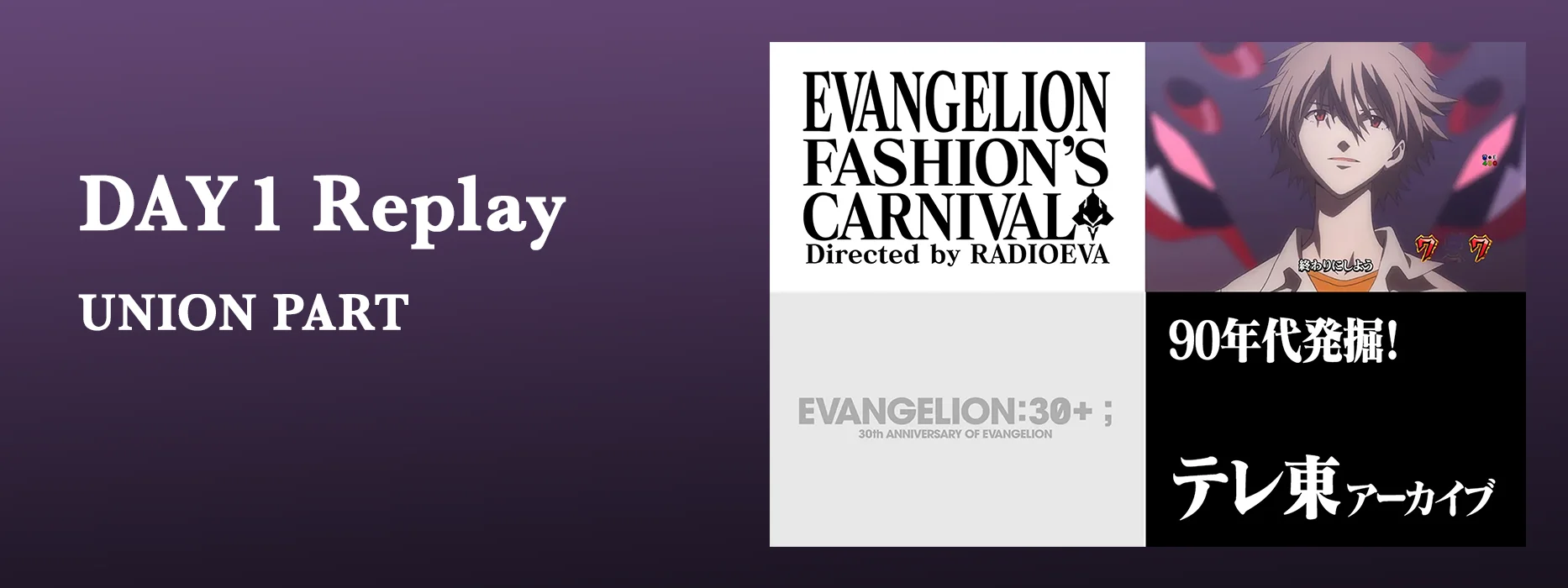 È il momento del palco, ricco di performance emozionanti! Unisciti al cast e agli ospiti speciali per un programma ricco di varietà, tra cui la prima sfilata di moda in assoluto "EVANGELION FASHION'S CARNIVAL" dei marchi ufficiali di abbigliamento Evangelion RADIO EVA ed EVANGELION:95, oltre a filmati inediti. ・EVANGELION FASHION'S CARNIVAL ・Una vetrina completa di tutte le console da gioco del passato ・Riscoperte degli anni '90! Contenuti d'archivio di TV Tokyo - Giorno 1 ...E altro ancora! ※Non ci sarà streaming dell'evento speciale per commemorare il 30° anniversario di Evangelion.